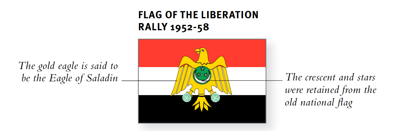 DIE VEREINIGTE ARABISCHE REPUBLIK Als die Vereinigte Arabische Republik (UAR) 1958 gegründet wurde, passten sie die Flagge der Befreiungsbewegung an, die den Unabhängigkeitsaufstand von 1952–53 anführte. Die Uar-Flagge war rot, weiß und schwarz, mit zwei grünen Sterne in der Mitte des weißen Streifens. Als die Föderation 1972 gegründet wurde, wurden die Sterne durch den Falken der Quraisch (siehe Seite 59) in Gold über dem Staatsnamen ersetzt. Im Jahr 1984 kehrte Ägypten zum Goldadler der Liberation Rally zurück. Diese Farben und das Adleremblem wurden in anderen arabischen Ländern häufig kopiert.