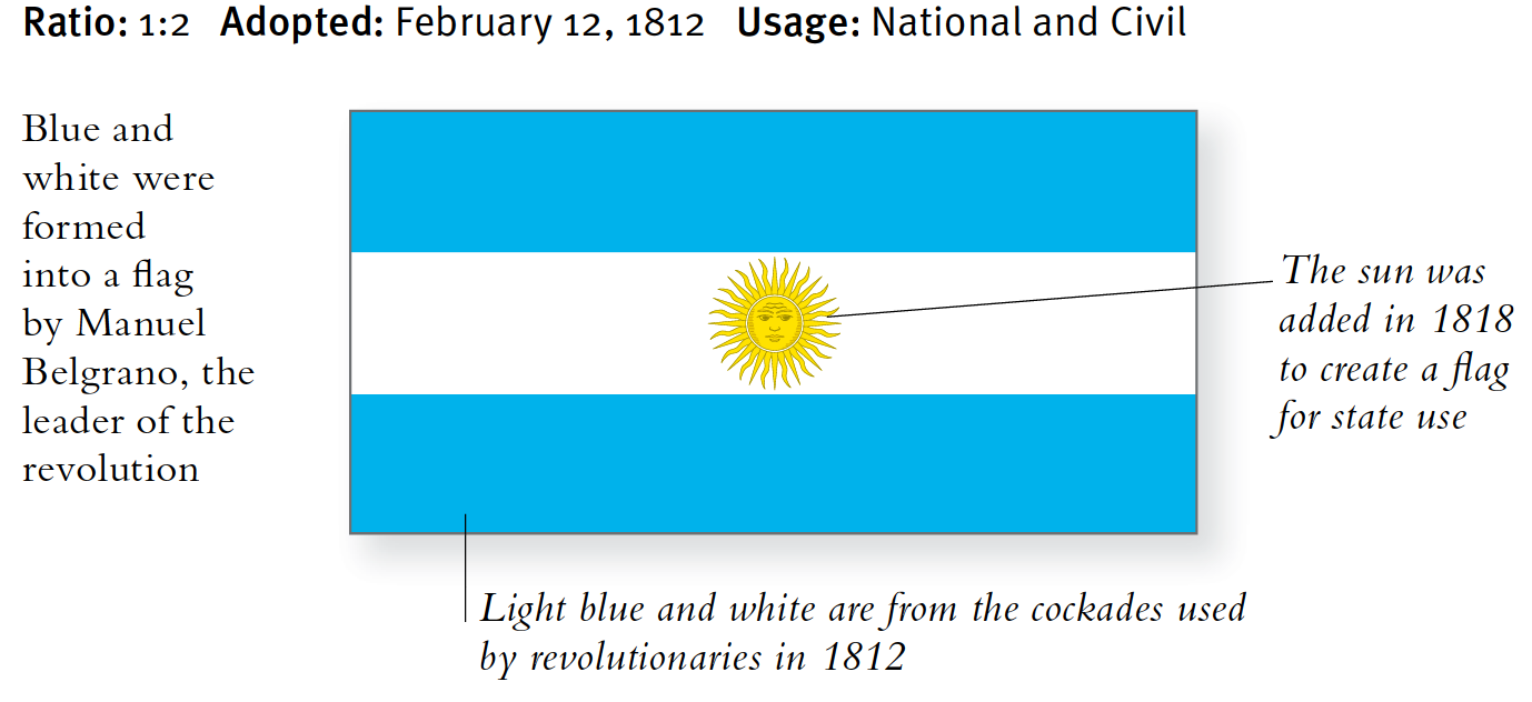 In seinem Lager in Rosario im Jahr 1812 brauchte der Revolutionskommandeur Manuel Belgrano eine Flagge. Er entwarf eine davon und verwendete dabei die himmelblauen und weißen Farben der Kokarden, die von Unabhängigkeitsbefürwortern getragen werden. Diese Flagge wurde im Kampf verwendet und. Obwohl die provisorische Regierung sie zunächst ablehnte, wurde sie später zur Nationalflagge.