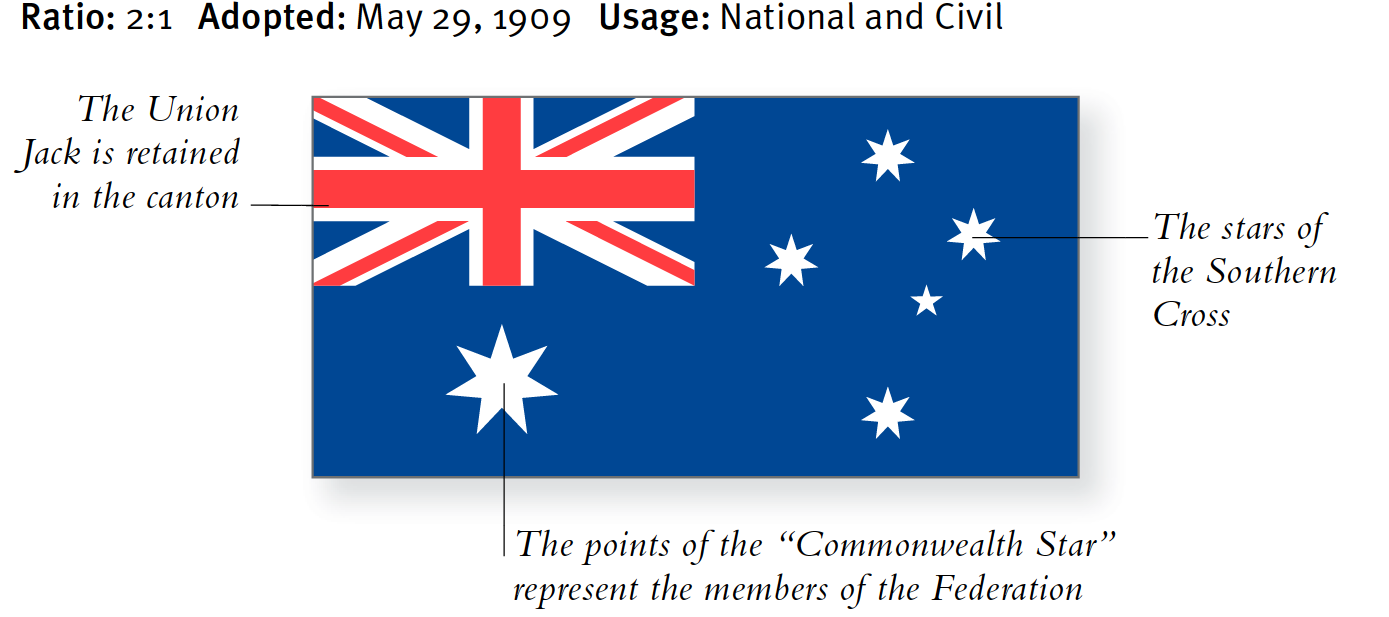 Die erste Nationalflagge wurde 1901 nach verschiedenen Designwettbewerben eingeführt, ihre Verwendung war jedoch eingeschränkt. Es enthält eine blaue Flagge und drei Motive, die Schlüsselaspekte der australischen Staatlichkeit würdigen.