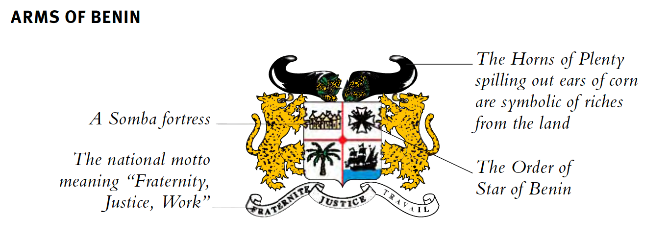 Die heute verwendete Flagge ist dieselbe wie die von 1959, obwohl nach der Revolution im Dezember 1975 im Kanton eine grüne Flagge mit einem roten Stern verwendet wurde. Die ursprüngliche Flagge wurde 1990 restauriert, ebenso wie das ursprüngliche Staatswappen. Der neue Name des Landes wurde beibehalten. Benin hat sowohl ein Siegel als auch ein Wappen Waffen. Das Siegel zeigt eine Piroge oder ein afrikanisches Kanu mit Pfeil und Bogen und zwei Keulen. Das Wappen besteht aus einem geviertelten Schild mit der Darstellung einer örtlichen Somba-Festung, der Medaille des Ordens des Sterns von Benin, einer Palme und einem Segelschiff. Das Motto lautet „Fraternité, Justice, Travail" und bedeutet „Brüderlichkeit, Gerechtigkeit, Arbeit".