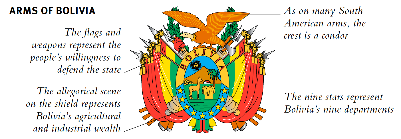 EINE NEUE TRICOLOR Im Jahr 1826 wurde die Flagge in drei gleiche Streifen in Gelb, Grün und Rot geändert, wobei sich das Wappen in der Mitte befand. Es war Die letzte Änderung erfolgte 1851, als die Reihenfolge der Streifen in Rot, Gelb, Grün geändert wurde. Die offizielle Flagge hat immer noch das Wappen in der Mitte. Es wurde 1888 reguliert und zeigt den Berg Potosí, ein Alpaka, eine Weizengarbe und einen Brotfruchtbaum. Der ovale Ring enthält neun Sterne für die neun Abteilungen.