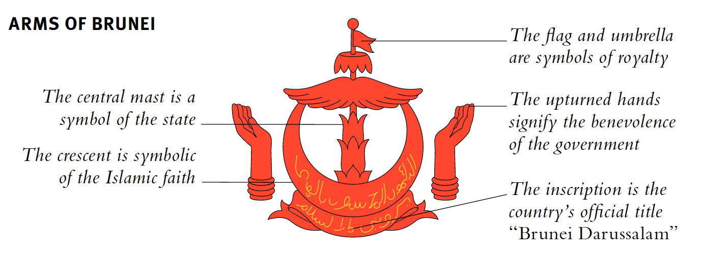 DIE NATIONALEN WAFFEN Das Wappen zeugt von Bruneis muslimischen Traditionen und zeigt in der Mitte den Halbmond, ein traditionelles Symbol des Islam. Das arabische Motto auf dem Halbmond bedeutet übersetzt „Immer Dienst leisten durch Gottes Führung"; Darunter trägt eine Schriftrolle die Inschrift „Brunei Darussalam" (Stadt des Friedens).