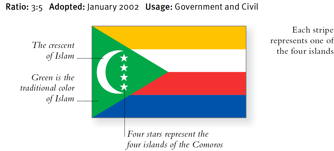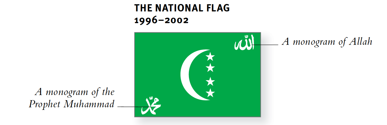 Die vorliegende Flagge basiert auf einer Flagge, die bei der Unabhängigkeit angenommen wurde und Sterne für die vier Hauptinseln (einschließlich Mayotte) und einen Halbmond als Symbol des Islam enthielt. Die ursprüngliche Flagge war hauptsächlich rot, um die sozialistischen Bestrebungen des Landes zu unterstreichen. Dies wurde 1978 zugunsten einer grünen Flagge mit dem Halbmond und den Sternen in Weiß abgeschafft. Die Verfassung von 1996 wurde die Flagge dahingehend geändert, dass sie in der oberen rechten und unteren linken Ecke die Monogramme Allahs und Mohammeds enthält. Die Komoren haben im Januar 2002 einen neuen Namen, eine neue Verfassung und eine neue Flagge angenommen. Die vier Sterne, die Mondsichel und das Grün des Islam wurden in ein Dreieck verschoben. Jeder Streifen aus Gelb, Weiß, Rot und Blau repräsentiert eine der vier Inseln.