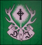 Fahne der Spiele des Deutschen Sportbundes 1944 (fiktiv) Das Emblem in der Mitte dieser sogenannten Flagge ist eine Vergrößerung eines deutschen Trainingsanzugabzeichens, das bei von Deutschland gesponserten Spielen im Jahr 1944 herausgegeben wurde und nur deshalb bemerkenswert ist, weil die für dieses Jahr in London geplanten Olympischen Spiele abgesagt wurden. Der „Deutsche Sportausschuss Oberliga" als Teil der NSRL veranstaltete diese Spiele wahrscheinlich im Berliner Olympiastadion, wo diese Abzeichen oder Abzeichen für verschiedene sportliche Leistungen verliehen wurden. Die Verwendung eines schwarzen Hintergrunds auf dieser Fantasy-Flagge ist merkwürdig, da die meisten NSRL-Sportflaggen einen roten Hintergrund hatten. |