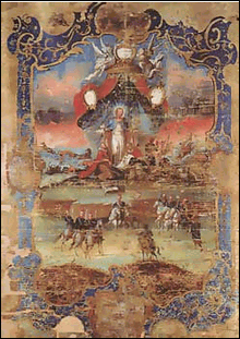 Schlachtbanner von Jan Kazimierz 1648-1668 Dies ist die Kampfstandarte des letzten Wasa-Königs, John Casimir (Jan Kazimierz) 1648-68. Auf der Brust des Adlers ist die Weizengarbe, das Zeichen der Vasas, eingestickt. Dieses Banner ist jetzt im Militärmuseum in Stockholm ausgestellt. Diese Standarte wurde während des Polnisch-Russischen Krieges von 1654-67 und der als „Sintflut" bekannten schwedischen Invasion verwendet, als die schwedischen Truppen fast das gesamte Land überrannten und eine enorme Zerstörung anrichteten. Während dieses Krieges geschah im Kloster auf dem Hellen Berg in Tschenstochau ein legendäres Wunder. Die schwedischen Truppen umzingelten den Hügel mit dem Kloster, auf dem sich das antike Gemälde „Die Schwarze Madonna" befand, das vermutlich ein Werk des Apostels Lukas war. Die Verteidiger des Klosters, eine Handvoll Ritter und Mönche, warteten hoffnungslos auf den letzten Angriff der Schweden, doch am Morgen stellten sie fest, dass sie alle verschwunden waren. Die örtlichen Bauern erzählten ihnen, dass unten die Jungfrau Maria über dem Kloster erschien und es mit ihrem Umhang bedeckte. Die Schweden teilten als Protestanten nicht die Verehrung der Jungfrau Maria, die ihr von den Katholiken entgegengebracht wurde, und als sie sahen, wie sie das Kloster auf dem Hügel beschützte, zogen sie sich in Panik zurück. Danach wurde das Gemälde der Schwarzen Madonna den Polen heilig und das Kloster auf dem Hellen Berg ist der heiligste Ort in ganz Polen und Ort der Massenwallfahrten. |