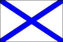 Die Flagge Russlands 1812-1841 Als Ivan Kuskov am 10. September 1812 Fort Ross errichtete und die nördliche „Kalifornii"-Küste für den Zaren beanspruchte, entfaltete er diese Flagge Russlands, das hellblaue Andreaskreuz auf einem weißen Feld. Später kaufte Kapitän John A. Sutter Fort Ross am 12. Dezember 1841 für 30.000 Dollar, hauptsächlich in Form von Nahrungsmitteln und etwas Gold, und das Fort ging schließlich in amerikanische Hände über. |