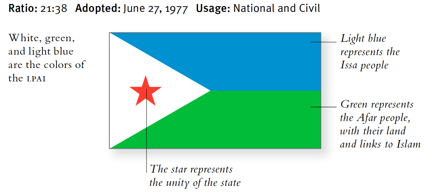 Die 1977 eingeführte Nationalflagge war eine Adaption der Flagge der Ligue Populaire Africaine pour l'Indépendance (lpai), die Dschibuti in die Unabhängigkeit führte. Die LPai-Flagge hatte ein rotes Dreieck mit einem weißen Stern. Bei der Nationalflagge, die bei der Unabhängigkeit eingeführt wurde, wurde der Stern aufrecht und nicht schräg angebracht Position und die Proportionen der Flagge wurden verlängert. Die Farben stehen für die Issas und die Afars, die beiden Völker Dschibutis bei der Unabhängigkeit, und der rote Stern für die Einheit des vielfältigen Staates. Im Mittelpunkt des Wappens stehen ein somalischer Schild und ein Speer, eingefasst von zwei Jagdmessern.