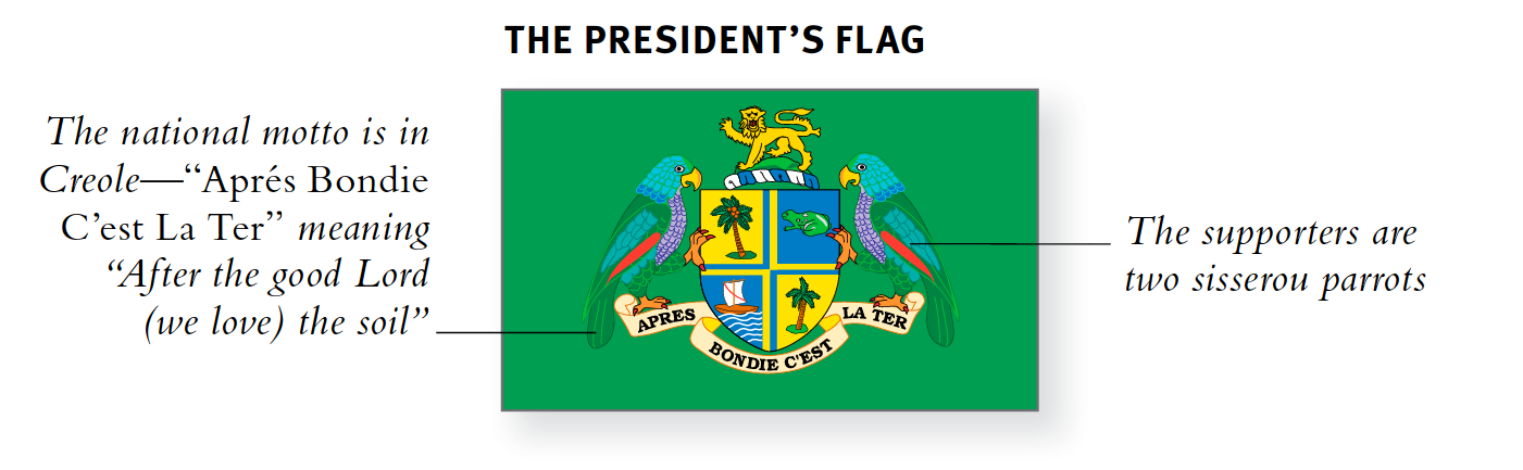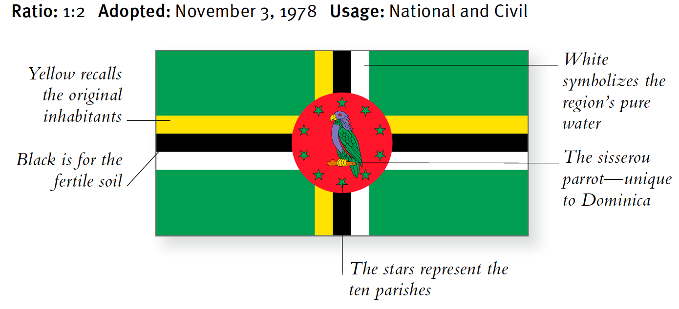 Die 1978 eingeführte Flagge zeigt das nationale Vogelemblem, den Sisserou-Papagei, der auch auf dem am 21. Juli 1961 verliehenen Wappen erscheint. Dieser Papagei kommt nur auf Dominica vor. Es handelt sich um eine vom Aussterben bedrohte Art; es sind nur noch wenige Paare übrig. Das grüne Feld repräsentiert die üppige Vegetation der Insel. Das Kreuz stellt die Dreifaltigkeit dar Der christliche Glaube und seine drei Farben erinnern an die Ureinwohner, den fruchtbaren Boden und das reine Wasser. Die zehn Sterne stehen für die zehn Gemeinden und die rote Scheibe für soziale Gerechtigkeit. Die Flagge des Präsidenten hat ein dunkelgrünes Feld mit dem Wappen in der Mitte, gekrönt von einem britischen Löwen. Es zeigt Palmen, einen einheimischen Frosch und das Meer.