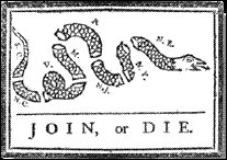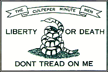 Die Culpeper-Minutemen-Flagge Diese Flagge repräsentierte eine Gruppe von Minutemen aus Culpeper, Virginia. Diese Männer gehörten zum ersten Virginia-Regiment von Oberst Patrick Henry im Jahr 1775. Dreihundert Culpeper Minutemen unter der Führung von Oberst Stevens marschierten zu Beginn der Kämpfe in Richtung Williamsburg. Ihre ungewöhnliche Kleidung erschreckte die Menschen, als sie durch das Land zogen. Sie trugen Bockschwänze in ihren Hüten und Tomahawks und Skalpiermesser hingen an ihren Gürteln. Das zentrale Symbol ihrer Flagge war eine zusammengerollte Klapperschlange, die kurz vor dem Angriff stand, und darunter die Worte „TRITT AUF MICH NICHT." Auf jeder Seite standen die Worte von Patrick Henry: „FREIHEIT ODER TOD!" Die Klapperschlange war schon vor der Revolution das beliebteste Tiersymbol der Amerikaner. Im Jahr 1751 brachte Benjamin Franklins Pennsylvania Gazette einen erbitterten Artikel, in dem er gegen die britische Praxis protestierte, Sträflinge nach Amerika zu schicken. Der Autor schlug vor, dass die Kolonisten den Gefallen revanchieren sollten, indem sie eine Ladung Klapperschlangen nach England verschifften, die dann in den Gärten der Adligen verteilt werden könnten. Drei Jahre später veröffentlichte die Gazette eine politische Karikatur einer Schlange als Kommentar zum Albany-Kongress. Um die Delegierten an die Gefahr der Uneinigkeit zu erinnern, wurde die Schlange in Stücke geschnitten gezeigt. Jedes Segment ist mit dem Namen einer Kolonie und dem Motto „JOIN or DIE" unten gekennzeichnet. Andere Zeitungen griffen das Schlangenthema auf. Einige zeitgenössische Flaggenfirmen verkaufen eine „JOIN or DIE"-Flagge mit dieser Zeichnung. Es gibt keine historischen Unterlagen, die die Existenz dieser Flagge belegen. |