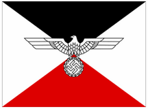 Flag of a Militärbefehlshaber 1940 Eine weitere Sonderstellung in den besetzten Gebieten war ein deutscher „Militärbefehlshaber". Er war Mitglied der Wehrmacht, befehligte jedoch keine militärischen Truppen. Vielmehr war er für die Wirtschaft und die Regierung eines besetzten Gebiets verantwortlich. Ein Militärbefehlshaber wurde vom Oberbefehlshaber des Heeres in seine Position eingesetzt. Bis 1941 hatte von Brauchitsch diese Position inne, dann übernahm auch Adolf Hitler selbst diese Position. Die Flagge eines Militärbefehlshabers ähnelte der eines Wehrmachtbefehlshabers, wies jedoch zwei Unterschiede auf. In der Mitte befand sich anstelle des Reichsadlers ein Wehrmachtsadler und unterhalb des Adlers befand sich in Weiß das Wort „Militärbefehlshaber". Die Flagge wurde ebenfalls 1940 eingeführt. |