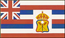Flagge des Königreichs Hawaii 1845-1898 Ein schwerwiegender Vorfall, manchmal auch Paulet-Affäre genannt, ereignete sich im Jahr 1843, als der britische Lord George Paulet von der HMS Carysfort in den Hafen von Honolulu einfuhr und ihn aufgrund von Beleidigungen und Fehlverhalten gegenüber britischen Untertanen eroberte. Paulet forderte die Abdankung von König Kamehameha III. und die Abtretung der Hawaii-Inseln an die britische Krone. Unter den Kanonen der Fregatte trat Kamehameha zurück, legte jedoch formellen Protest sowohl bei der britischen Regierung als auch bei Paulets Vorgesetztem, Admiral Richard Thomas, ein. Thomas lehnte Paulets Vorgehen ab und stellte am 31. Juli 1843 die hawaiianische Regierung wieder her. In seiner Rede zur Wiederherstellung erklärte Kamehameha: „Ua mau ke ea o ka´aina i ka pono" (Das Leben des Landes wird in Gerechtigkeit verewigt), was zum Motto des zukünftigen Staates Hawaii wurde. Die Paulet-Affäre überzeugte König Kamehameha davon, dass er seine Marine und Verteidigungsanlagen wieder aufbauen musste, damit nicht ein einziges Schiff seine Regierung erneut stürzen konnte. Im Jahr 1845 ließ er auch die Flagge des Königreichs neu gestalten und reduzierte die Anzahl der Streifen auf acht, um die Anzahl der großen Inseln im hawaiianischen Königreich widerzuspiegeln. Im Jahr 1898 wurde Hawaii von den Vereinigten Staaten annektiert und die Musterflagge von 1845 wurde zur US-Territorialflagge. dann wurde sie nach 1960 zur Staatsflagge. Der Sturz des Königreichs Hawaii und die anschließende Annexion wurden als erstes großes Beispiel des amerikanischen Imperialismus bezeichnet. |