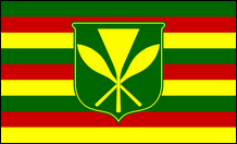 Flagge der Ureinwohner Hawaiis 2001 Die Flagge der Kanaka Maoli (einheimischer Hawaiianer) soll lange vor der modernen hawaiianischen Flagge Kamehamehas persönliche Flagge gewesen sein. Ihren Erfindern zufolge zerstörte der britische Marinekapitän Lord George Paulet die Kanaka Maoli, als er 1843 für fünf Monate die Kontrolle über Hawaii übernahm. Die Flagge, die Paulet jedoch beschlagnahmte, war die rot-weiß-blau gestreifte hawaiianische Flagge, die um 1816 für Kamehameha I entworfen wurde und von dem die moderne US-Staatsflagge direkt abstammt. Die Kanaka-Maoli-Flagge ist eine moderne kommerzielle Erfindung, die diejenigen ansprechen soll, die eine hawaiianische Souveränitätsbewegung unterstützen. Die Kanaka-Maoli-Flagge wurde 2001 von Gene Simeona entworfen und dann von seinem Geschäftspartner Stan Fonseca produziert. Es gibt keine historischen Beweise für die Existenz der Flagge vor dieser Zeit. In der Mitte der Flagge befindet sich ein grüner Schild mit einem Wappen, zu dem ein Kahili, die ursprüngliche hawaiianische Königsstandarte, und zwei Paddel gehören, die die Reisetradition der hawaiianischen Ureinwohner repräsentieren sollen. Das Farbschema der Flagge ist Rot, Gelb und Grün und soll verschiedene Gruppen innerhalb der hawaiianischen Gesellschaft repräsentieren. Das Gelb ist ein Symbol für die „Alii", die mächtige königliche Klasse. Rot steht für die „Konohiki", die Landkaste, die den Alii diente. Grün steht für „Makaainana" oder Bürger. Die Flagge erfreut sich in den letzten Jahren großer Beliebtheit und ist auf allem zu finden, von T-Shirts bis hin zu Autoaufklebern. |