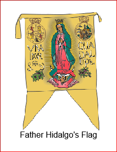 Der Standard der Jungfrau von Guadalupe 1810 Ein unbekannter Landpater namens Miguel Gregorio Antonio Ignacio Hidalgo y Costilla y Gallaga Mondarte Villaseñor wurde ein Revolutionsführer, der sich für die Unabhängigkeit Mexikos einsetzte, als er in einer frühen Sonntagsmesse leidenschaftlich zu den Waffen gegen die spanische Herrschaft rief. Der Legende nach schnallte sich Pater Hidalgo ein Schwert um und wurde Anführer des ersten erfolglosen Versuchs, die mexikanische Unabhängigkeit zu erlangen. Dieses Banner wurde von Pater Hidalgo in der Revolution von 1810 verwendet. Es stammte aus einer Franziskanerkirche und war eines der vielen Banner, die seine Anhänger verwendeten. Der Legende nach übernahmen die royalistischen Streitkräfte die Jungfrau der Remedios als Banner und gaben ihr den Rang eines Feldmarschalls, um Hidalgos Standarte herabzusetzen. Pater Hidalgo und die meisten seiner Rebellenführer wurden von den königlichen Streitkräften gefangen genommen oder getötet. Er wurde 1811 vor Gericht gestellt und hingerichtet. |