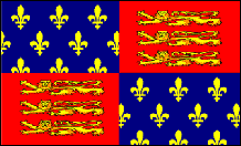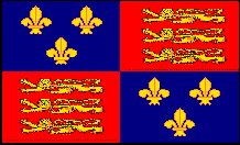 The Royal Standard of England 1307-1405 Royal Standards had the place now taken by national flags. This particular standard was used during the reigns of Edward II (1307-1327), Edward III (1327-1377), Richard II (1377-1399) and the first part of the reign of Henry IV (1399-1413). The first quarter of a flag, top left if the hoist is at the left, is the position of greatest importance. The French fleur-de-lis in the first quarter show that the Plantagenet Kings still thought that their claim to the throne of France was more significant than their occupation of the throne of England. In 1365, the fleur-de-lis on the French Royal Standard were changed from a "scatter" across the whole field, to a symmetrical arrangement of just three flowers. In 1405, Henry IV had the English Coat of Arms redesigned to reflect the change. The Royal Standard of England 1405-1603 The Royal Standard of 1405-1603 was the same basic design, but used the new fleur-de-lis arrangement. It was used for the reigns of Henry IV (1399-1413), Henry V (1413-1422), Henry VI (1422-1471), Edward IV (1461-1483), Edward V (1483), Richard III (1483-1485), Henry VII (1485-1509), Henry VIII (1509-1547), Edward VI (1547-1553), Mary I (1553-1554), and Elizabeth I (1558-1603). |