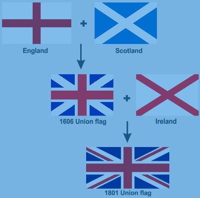 + Kreuz des Heiligen Andreas + Kreuz des Heiligen Patrick Als Irland hinzugefügt wurde, beachten Sie, wie das weiße Kreuz des Heiligen Andreas und das rote Kreuz des Heiligen Patrick kombiniert wurden. Das Kreuz des Heiligen Andreas befindet sich oben auf der linken Seite, da er der „ältere" Heilige war. Wenn zwei Kreuze auf diese Weise verbunden werden, sind sie „ gegenvertauscht ".