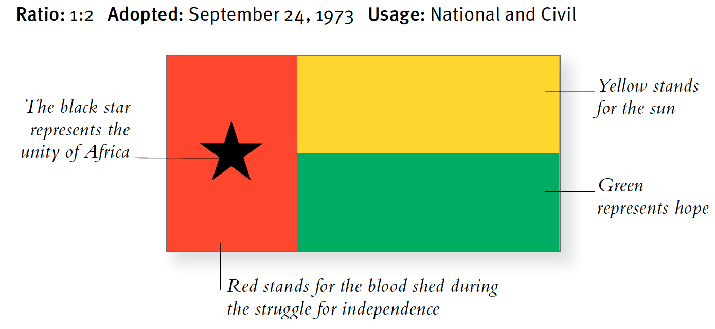 DER GHANAISCHE EINFLUSS Die Parteiflagge wurde von der Flagge Ghanas abgeleitet, die erstmals die Flagge verwendete panafrikanische Kombination aus Rot, Gelb, Grün und Schwarz im Jahr 1957. Aus ghanaischer Sicht steht der schwarze Stern für die Einheit Afrikas. Die Farben sollen heute für das vergossene Blut für Unabhängigkeit, Hoffnung und die Sonne als Quelle des Lebens stehen. Das Wappen besteht aus dem Paigc-Abzeichen, einem schwarzen Stern und einer Jakobsmuschel.