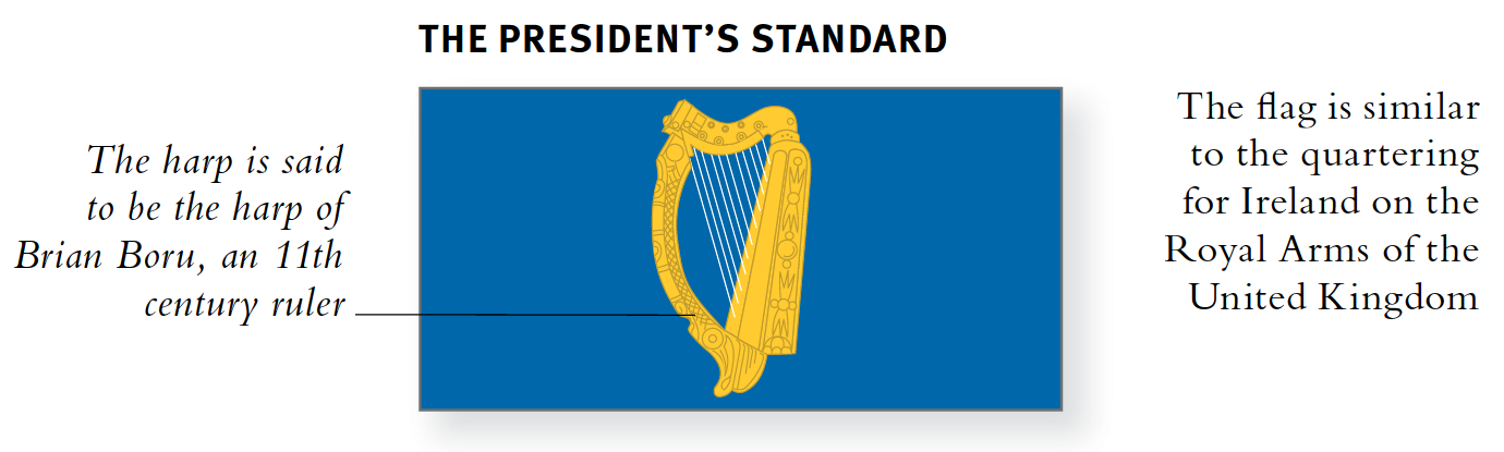 DER STANDARD DES PRÄSIDENTEN Die Flagge des Präsidenten wurde 1945 eingeführt und basiert auf der alten „Grünen Flagge", einem traditionellen Symbol des irischen Nationalismus.