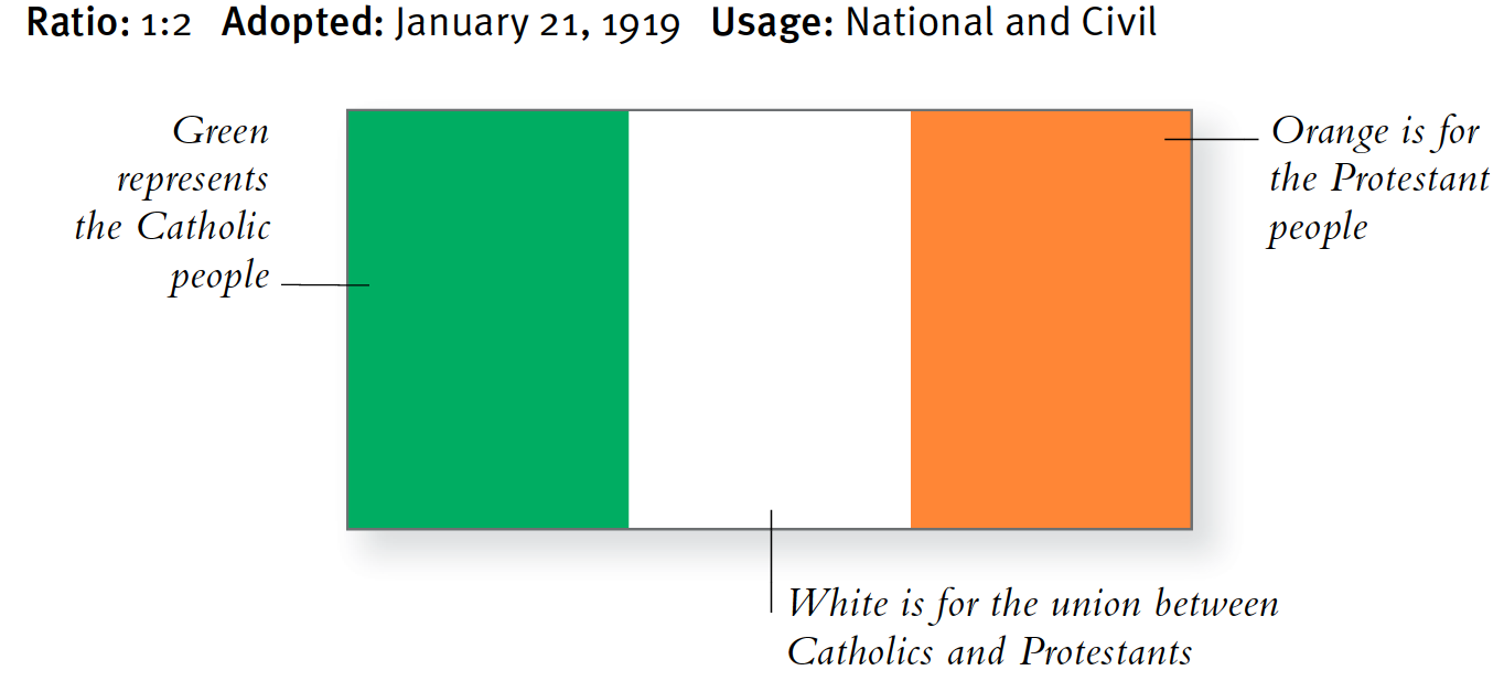 Die irische Flagge ist der französischen Trikolore nachempfunden. Es wurde zum ersten Mal von Nationalisten während ihres Kampfes um die Freiheit von Großbritannien im Jahr 1848 geflogen, einem Jahr der europaweiten Revolution. Doch erst mit dem Osteraufstand von 1916 wurde sie zur Nationalflagge. Es wurde 1919 offiziell bestätigt und 1937 in die Verfassung aufgenommen. Die grüne Farbe auf der Flagge vertritt die katholische Mehrheit; Orange steht für die protestantische Minderheit (ursprünglich Anhänger Wilhelms von Oranien) und Weiß steht für den Frieden zwischen den beiden Glaubensrichtungen.