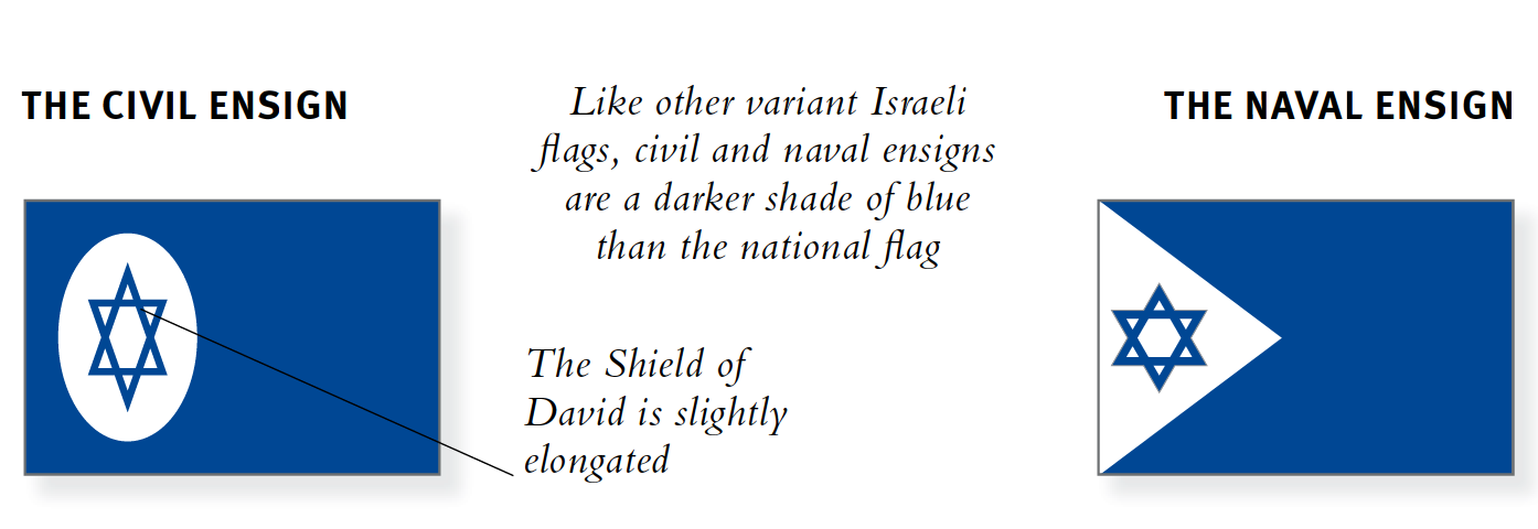 DAVIDSTERN Das zentrale Emblem in Form eines Hexagramms ist als „Magen David" (Schild Davids) bekannt, ein Emblem, das früher verwendet wurde Jüdische Flaggen waren jahrhundertelang im Einsatz, bevor sie als Nationalflagge Israels übernommen wurden. Die Farben Blau und Weiß sollen an die Farben des Tallith (jüdischer Gebetsschal) erinnern. Das Blau wird offiziell als „Yale Blue" bezeichnet. Es ist ein hellerer Farbton als bei anderen israelischen Flaggen. Die Handelsflagge wurde 1948 eingeführt. Es gibt auch eine Marineflagge mit ähnlichem Design.