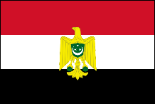 Flagge Ägyptens (Föderation der Arabischen Republiken) 1972-1984 1972 schlossen sich Ägypten, Syrien und Libyen zusammen und nannten sich Föderation der Arabischen Republiken. Die Flagge dieser neuen Union war erneut eine rot-weiß-schwarze dreifarbige Flagge mit dem goldenen „Falken von Qureish", in dessen Mitte eine Schriftrolle mit dem arabischen Namen der Föderation stand. |