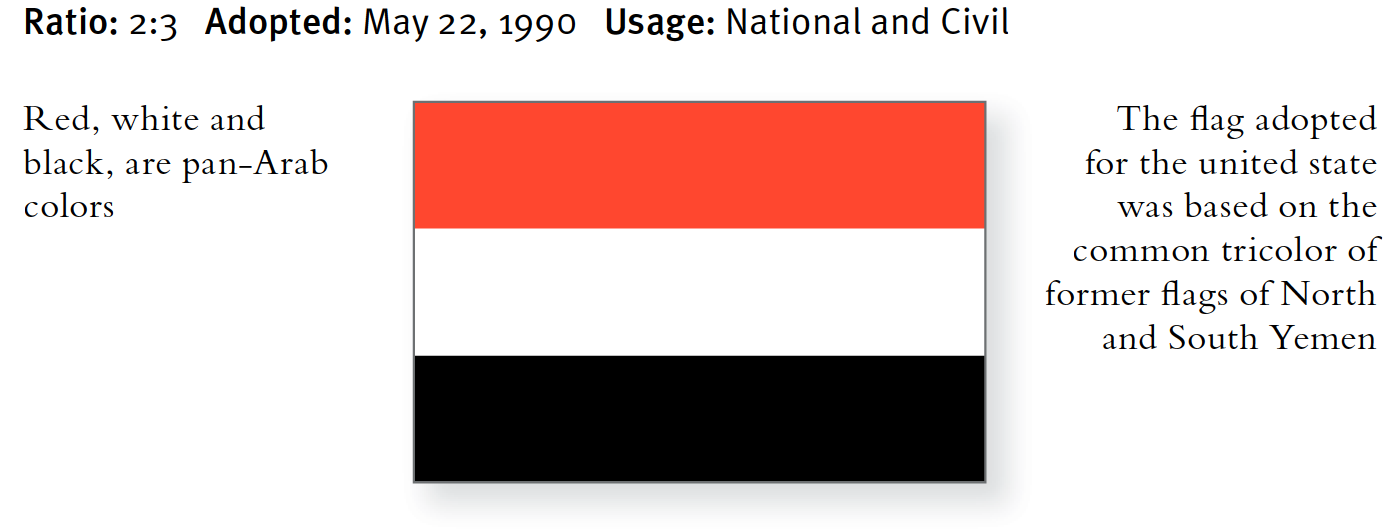 EINE EINHEITLICHE FLAGGE Als sich Jemen vereinigte, wurden die Sterne und das Dreieck abgeschafft, aber die gemeinsamen Elemente ihrer Flaggen – die panarabischen roten, weißen und schwarzen Streifen – wurden für die vereinte Flagge beibehalten. Das Muster der neuen Flagge deutet auf einen Kompromiss zwischen dem offiziell säkularen Süden und dem islamischen Norden hin.