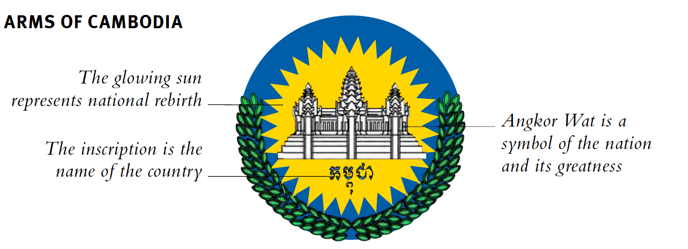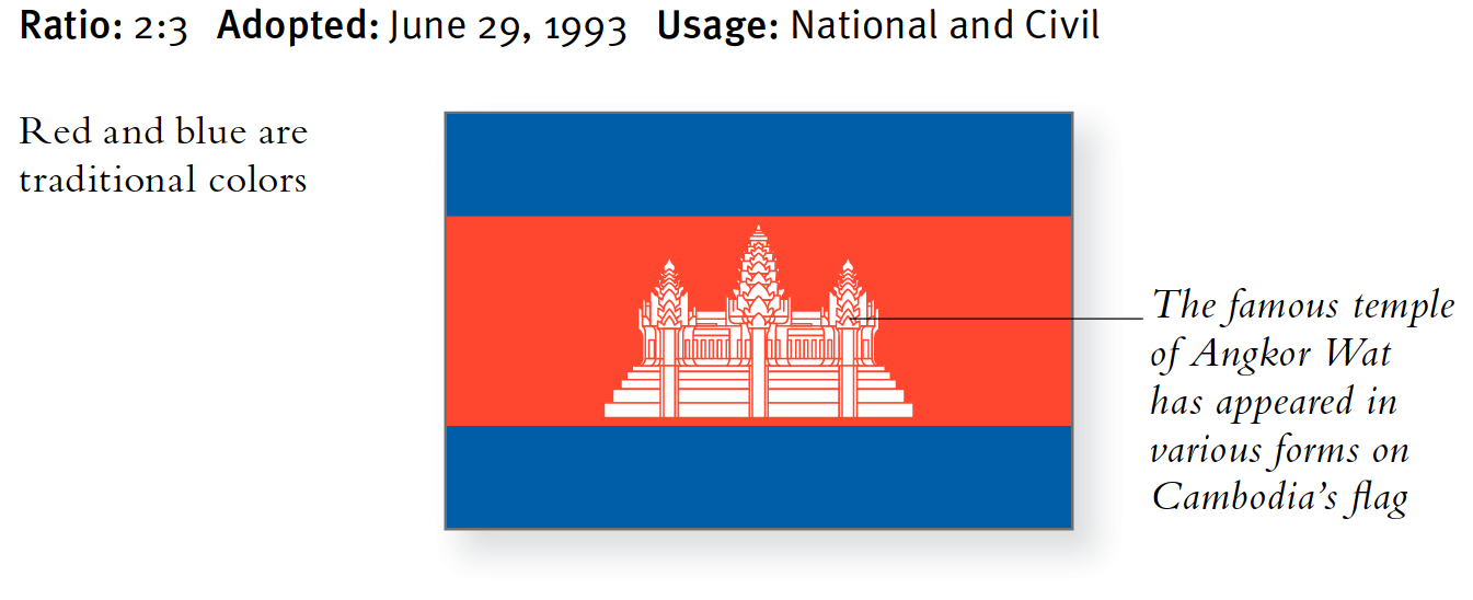 Die heute verwendete Flagge ist dieselbe wie die im Jahr 1948 eingeführte, obwohl seitdem fünf andere Designs verwendet wurden. Fast alle haben sich in der einen oder anderen Form des Bildes des Tempels von Angkor Wat bedient. Diese berühmte Tempelanlage stammt aus dem 12. Jahrhundert erbaut von den Mahidharapura-Monarchen. Es verfügt über fünf Türme, die jedoch nicht immer alle in der stilisierten Version auf Flaggen abgebildet waren. Der Tempel erscheint auch auf den Armen. Die Monarchie wurde im September 1993 wiederhergestellt, die Flagge von 1948 wurde im Juni desselben Jahres wieder eingeführt.