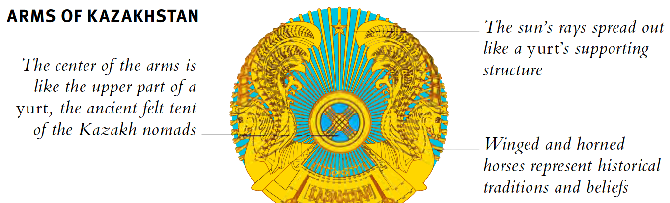 Die postkommunistische Flagge Kasachstans wurde 1992 eingeführt. Ihr himmelblauer Hintergrund erinnert an den endlosen Himmel über dem kasachischen Volk. Es symbolisiert auch Wohlbefinden, Ruhe, Frieden und Einheit. In der Mitte der Flagge, unter einer goldenen Sonne mit 32 Strahlen, schwebt ein Vogel der Art, die vor Ort als Berkut bekannt ist Steppenadler. Zusammen repräsentieren sie Liebe, Freiheit und die Sehnsüchte des kasachischen Volkes. Ein Muster sogenannter „nationaler Ornamente" bildet einen vertikalen Streifen in der Nähe des Hebezeugs. Auch das neue Wappen basiert auf einer strahlenden Sonne. Es zeigt traditionelle Merkmale Kasachstans.
