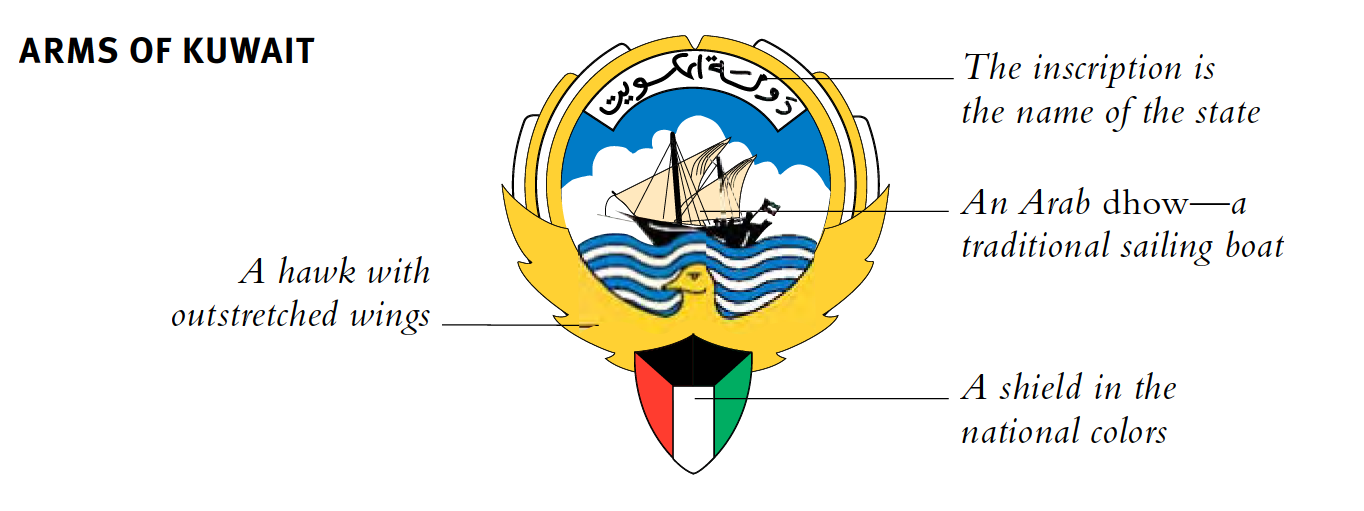 KUWAITS WAPPEN Das Wappen zeigt einen Falken, der eine arabische Dhau auf stilisierten Wellen trägt.