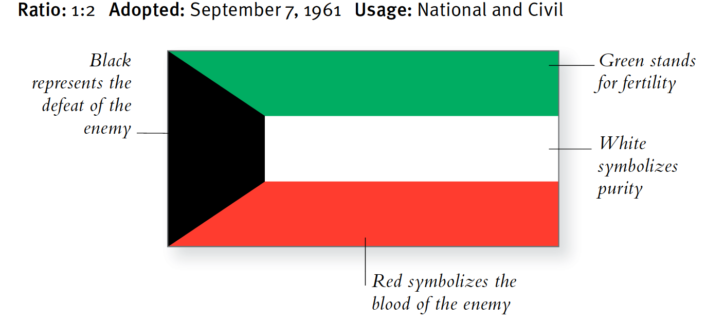Vor 1961 war die Flagge Kuwaits, wie auch die der anderen Golfstaaten, rot und weiß. Die vorliegende Flagge ist in den panarabischen Farben gehalten, aber jede Farbe ist auch für sich genommen bedeutsam. Schwarz symbolisiert die Niederlage des Feindes, während Rot die Farbe des Blutes auf den kuwaitischen Schwertern ist. Weiß symbolisiert Reinheit und Grün steht für Fruchtbarkeit Land. Die Idee für das charakteristische Design der Flagge – eine horizontale Trikolore mit einem schwarzen Trapez am Hiss – stammt möglicherweise von der Flagge, die der Irak bis in die späten 1950er Jahre verwendete.