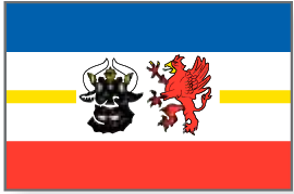 Diese 1991 eingeführte Flagge kombiniert das Blau und Weiß Pommerns mit den Blau-, Gelb- und Rottönen Mecklenburgs. Der Stier und der Greif sind ebenfalls lokale Wahrzeichen. Rot-Weiß erinnern an die Hanse.