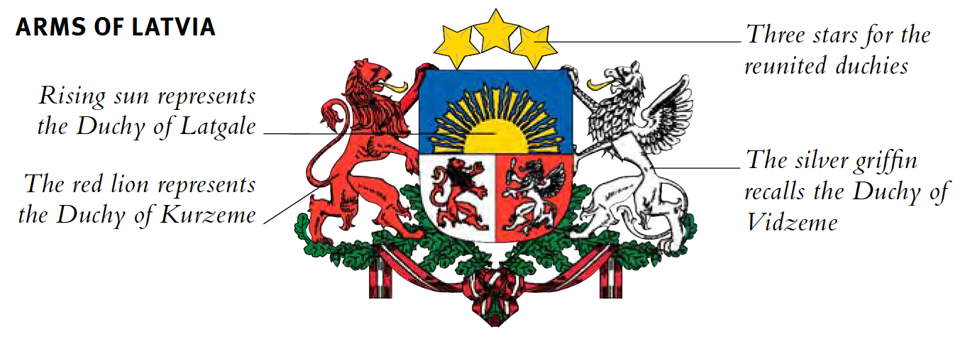 Obwohl die lettische Flagge bereits 1922 offiziell eingeführt wurde, war sie bereits im 13. Jahrhundert in Gebrauch, wurde jedoch während der Sowjetherrschaft unterdrückt. Die rote Farbe wird manchmal als Symbol für die Bereitschaft der Letten beschrieben, ihr Herzblut für die Freiheit zu geben. Eine alternative Interpretation, entsprechend Einer Legende zufolge wurde ein lettischer Anführer im Kampf verwundet und die Ränder des weißen Lakens, in das er gehüllt war, waren mit seinem Blut befleckt. Das Wappen zeigt einen dreiteiligen Schild, der an die drei wiedervereinigten Herzogtümer Lettlands erinnert. Der Schild wird von einem roten Löwen und einem silbernen Greif gehalten.