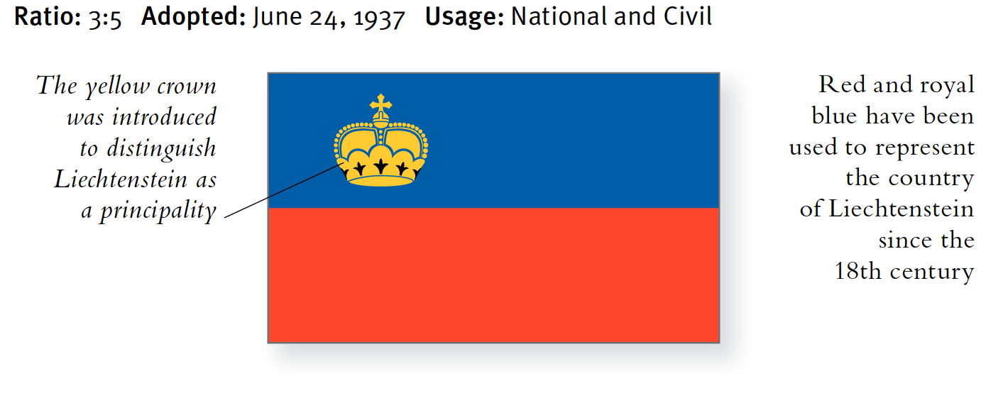 Die rot-blaue Flagge Liechtensteins stammt aus dem Jahr 1921. Bei den Olympischen Spielen 1936 in Berlin kam es zu Verwirrung, weil die Flagge der haitianischen Flagge sehr ähnlich war. 1937 wurde die Krone in die Flagge Liechtensteins eingeführt, um den Status des Landes als Fürstentum zu etablieren und es von der haitianischen Flagge zu unterscheiden. Die Flagge kann aufgehängt werden vertikal oder horizontal, aber die Krone bleibt immer aufrecht.