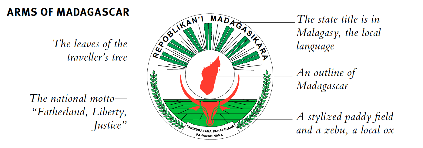 Die Flagge wurde mit der Erlangung der Selbstverwaltung im Jahr 1958 eingeführt und bis zur Unabhängigkeit beibehalten. Rot und Weiß sollen das frühere Merina-Königreich symbolisieren, dessen Flaggen alle rot und weiß waren, mit dem Zusatz Grün für die Hova, die ehemalige Bauernklasse. Das Wappen hat seit der Unabhängigkeit mehrmals geändert. Die Karte der heutigen Republik, eingeführt im März 1993, zeigt eine Karte der Insel mit einem Blätterbüschel. Darunter befindet sich ein Reisfeld, auf dem der Kopf eines Zebus thront. Das Motto lautet „Vaterland, Freiheit, Gerechtigkeit". Über dem Design steht der Name des Landes.