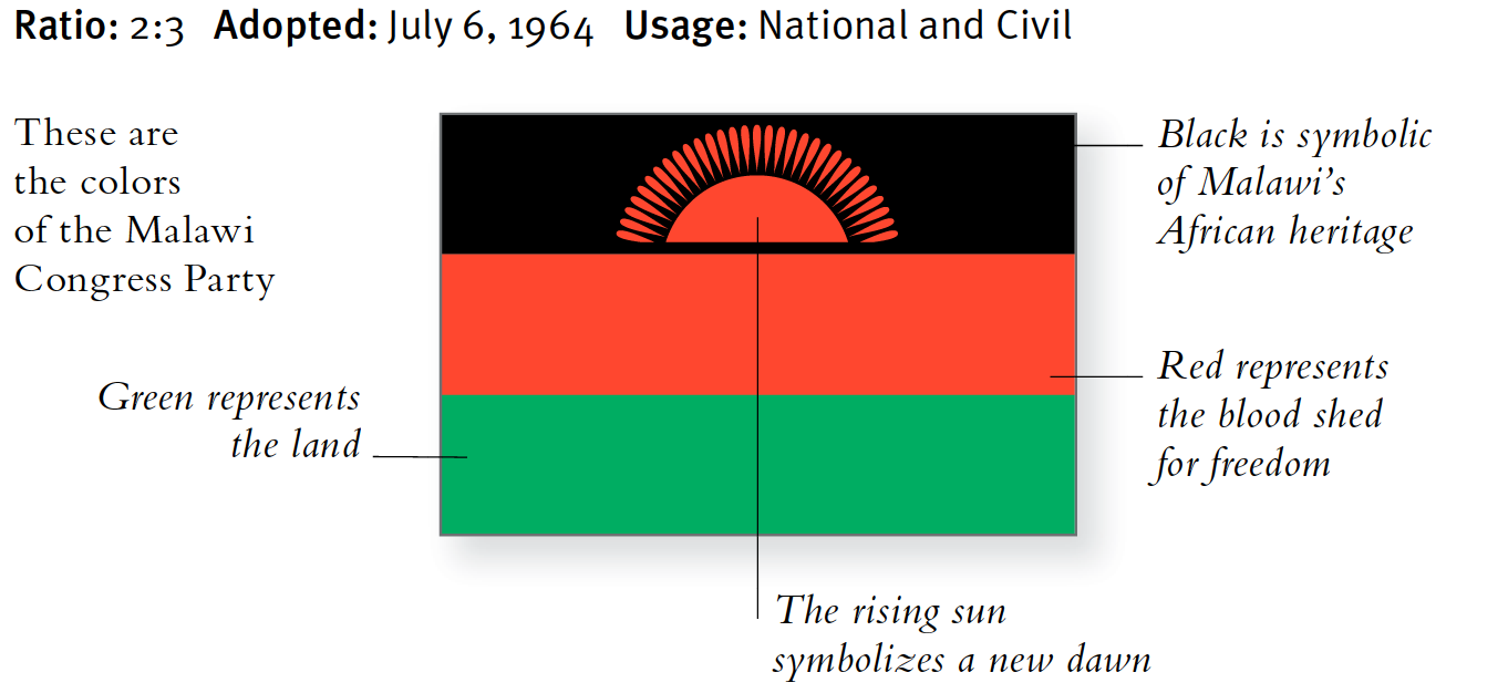 Als Njassaland-Krieg Malawi von 1953 bis 1963 Teil von Britisch-Rhodesien und Njassaland. Im Jahr 1964 wurde es völlig unabhängig. Die Farben der Flagge sind die gleichen wie die der Malawi Congress Party (MCP), die das Land 1964 in die Unabhängigkeit führte. Die MCP-Flagge wurde von der Flagge abgeleitet, die Marcus Garvey zur Zeit des Ersten Weltkriegs als Flagge von bekannt machte Afrika oder „Äthiopien" symbolisiert eine afrikanische Renaissance. Für Malawis Nationalflagge wurde die aufgehende Sonne oder Kwacha in Rot hinzugefügt. Die Kwacha erschien auch auf dem 1914 eingeführten Kolonialwappen. Sie wurde auf den aktuellen Wappen beibehalten, die 1964 mit der Flagge verliehen wurden