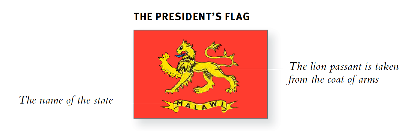 DIE FLAGGE DES PRÄSIDENTEN Die Flagge des Präsidenten hat ein leuchtend rotes Feld. Es verwendet den Löwenpassanten in der Mitte des Wappens mit dem Namen „Malawi".