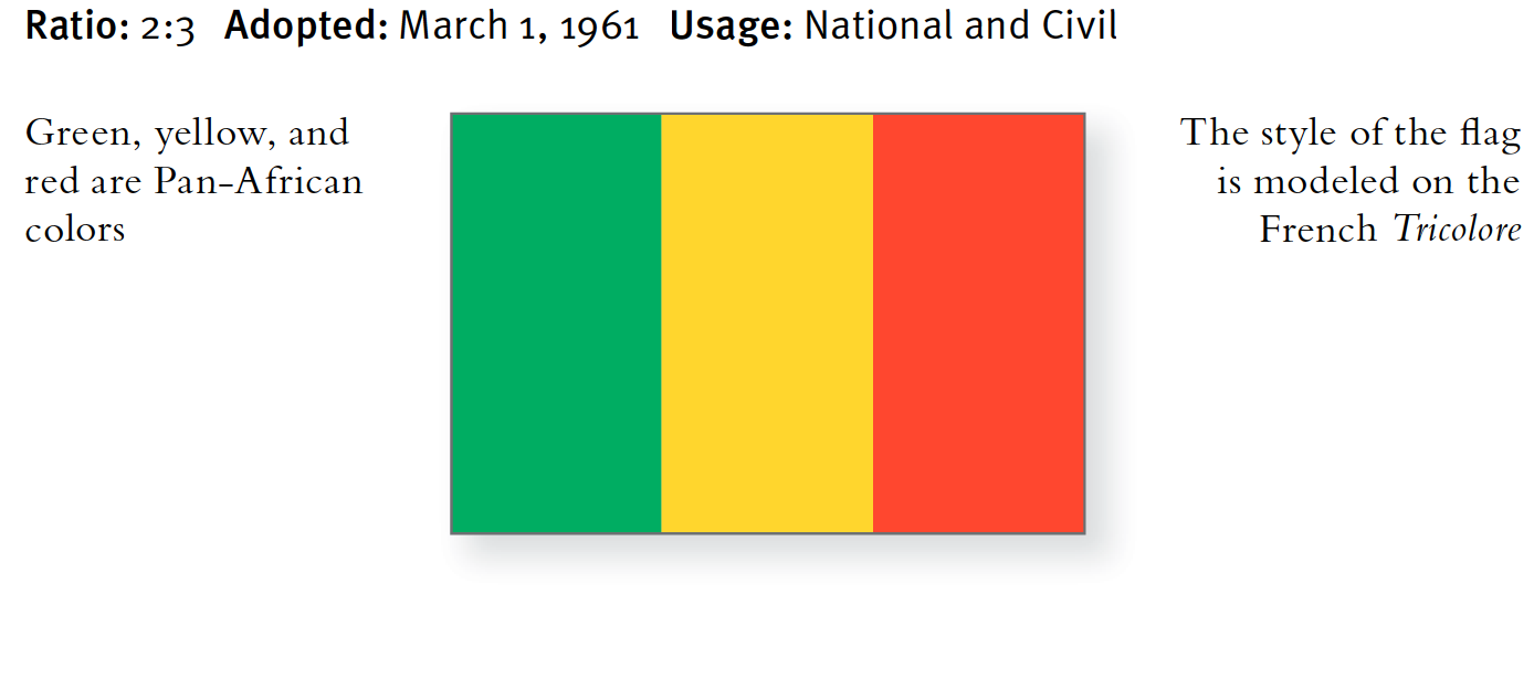 Die 1959 für die Konföderation eingeführte Flagge war eine Nachahmung der Flagge Ghanas, folgte jedoch dem Stil der französischen Trikolore. Es war mit einem schwarzen Emblem versehen, das als Kanaga bekannt ist, eine stilisierte menschliche Figur. Die Farben sollten die Verbundenheit mit anderen afrikanischen Nationen widerspiegeln. Nach der Trennung der beiden Länder 1960 wurde die Flagge in Mali bis zum 1. März 1961 verwendet, als die schwarze Figur fallengelassen wurde. Auch Mali hat ein Siegel, wie auch die anderen ehemaligen französischen Kolonien. Es ist ungefärbt und zeigt eine örtliche Festung zwischen zwei Pfeilen und Bögen. Über der Festung prangt eine Friedenstaube und darunter eine aufgehende Sonne.