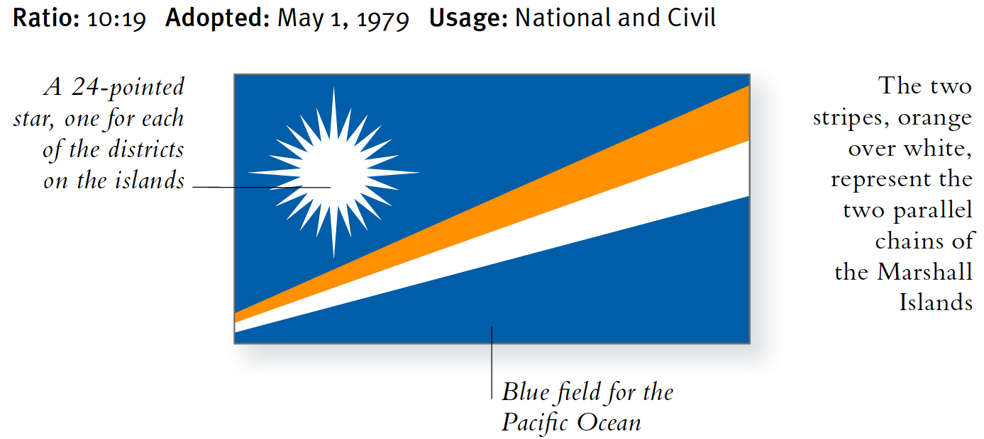 EINE FLAGGE FÜR EINE PAZIFISCHE INSEL Das dunkelblaue Feld der Flagge stellt das weite Gebiet des Pazifischen Ozeans dar, über das die Inseln verstreut sind. Der Stern symbolisiert die geografische Lage der Inseln, die einige Grad über dem Äquator liegen. Der Stern hat 24 Spitzen und repräsentiert die 24 Gemeinden der Marshallinseln. Vier seiner Strahlen erstrecken sich weiter als die anderen und stehen für die Hauptstadt Majuro und die Verwaltungsbezirke Wotji, Yaluit und Kwajalein. Sie bilden auch ein Kreuz und symbolisieren den christlichen Glauben der Marshallesen.