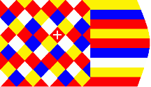 Regiment Granweiler 1569 Das Regiment Granweiler war ein weiteres deutsches Regiment in der Schlacht von Moncontour im Oktober 1569 während des Dritten Hugenottenkrieges in Frankreich. Diese Regimentsflagge hatte sieben horizontal geteilte Streifen. Der Mittelstreifen war rot mit dem weißen Kreuz der Allianz der Hugenotten in der Mitte. Die anderen Streifen waren von oben nach unten: Rot-Gelb-Mischfarben-Mischfarben-Blau-Weiß. Die Mischfarbenstreifen waren horizontal zweimal in Blau-Rot-Gelb-Weiß (oben) und Weiß-Gelb-Rot-Blau (unten) unterteilt. |