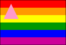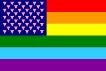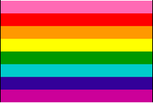 Die New Glory Flag um 1990 Eine Fusion der „Gay Rights, Gay Pride"-Flagge und der „Regenbogenkinder"-Flagge der 1970er Jahre hat zu dieser interessanten Flagge geführt. Die neue Regenbogenflagge „Old Glory" ist eine neuere Entwicklung. Im Grunde wird der Gay-Pride-Flagge ein bekannter blauer Streifen mit 50 Sternen hinzugefügt, um zu betonen, dass gleiche Rechte für Schwule und Lesben in allen 50 Bundesstaaten von entscheidender Bedeutung sind. Diese seltsame Verschmelzung der langhaarigen „Regenbogenkinder" der 60er und 70er Jahre mit den Schwulen der 90er Jahre ist eine interessante vexillologische Entwicklung. Es sollte jedoch beachtet werden, dass die „alte" New Glory-Flagge dreizehn mehrfarbige Streifen in einer etwas anderen Reihenfolge aufwies, obwohl sie im allgemeinen Erscheinungsbild einander ähnelten, während diese dreizehn Streifen auf der „neuen" Flagge durch ersetzt wurden nur die sechs farbigen Streifen der Schwulenbewegung. Eine ähnliche und interessante Variante dieser Flagge, bei der die Sterne durch rosa Dreiecke ersetzt wurden, erschien erstmals 2008 bei der LGBT Equality Rally in Las Vegas. Varianten dieses Grunddesigns tauchen immer wieder auf und sind sowohl im Internet als auch auf LGBT-Demonstrationen zu sehen. |