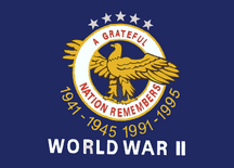 50. Jahrestag der Flagge des Zweiten Weltkriegs 1945-1995 Das US-Verteidigungsministerium gab eine Flagge zum 50. Jahrestag des Zweiten Weltkriegs als erste einer neuen, offiziell genehmigten Reihe von Gedenkflaggen heraus, die den 50. Jahrestag moderner amerikanischer Militärkampagnen und derjenigen, die darin gedient haben, ehren und gedenken sollen. Dieser Flagge zum 50. Jahrestag des Zweiten Weltkriegs wird im Jahr 2000 eine Flagge zum 50. Jahrestag des Koreakriegs und im Jahr 2015 eine Flagge zum 50. Jahrestag des Vietnamkriegs folgen , um die Veteranen dieser Konflikte zu ehren. Auf dem Design der Flagge zum 50. Jahrestag des Zweiten Weltkriegs ist der amerikanische Weißkopfseeadler abgebildet, dessen Kopf dem Hebezeug zugewandt ist, die Flügel ausgestreckt sind und einen weißen Kreis auf einem blauen Feld überlappen, auf dem die roten Worte „Eine dankbare Nation erinnert sich" kreisen, um diejenigen zu ehren, die dort gedient haben Zweiter Weltkrieg zwischen 1941 und 1945 sowohl im Pazifik als auch in Europa. |