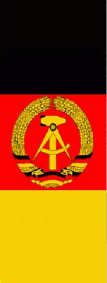 Die Flagge der Deutschen Demokratischen Republik 1959-1990 Am Ende des Zweiten Weltkriegs errichtete die UdSSR in Osteuropa befreundete Pufferstaaten. Die Deutsche Demokratische Republik oder Ostdeutschland war einer dieser „Satellitenstaaten" mit Ostberlin als Hauptstadt. Anschließend demontierte die Sowjetunion im Wesentlichen die ostdeutschen Fabriken und verschiffte sie zusammen mit allen anderen Ressourcen, die sie ergattern konnte, nach Russland zurück. Anschließend setzte sie eine kommunistische Marionettenregierung ein, die für den Rest zuständig war. |