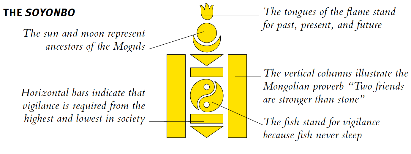 Die heutige Nationalflagge ersetzte 1940 die Rote Flagge der Revolution. Das rote Feld wird an der Fliege und am Hebezeug beibehalten, obwohl die ursprüngliche sozialistische Konnotation der Farbe allgemeineren Themen wie Fortschritt und Wohlstand gewichen ist. Die himmelblaue Tafel stellt das Volk der Mongolei dar und beschwört das Kaiserreich Tage von Dschingis Khan. Die Flagge trägt ein buddhistisches Emblem aus dem 17. Jahrhundert, das Soyonbo genannt wird. Der Soyonbo besteht aus verschiedenen Ideogrammen, die unterschiedliche Elemente der buddhistischen Weltanschauung darstellen. Der kommunistische Stern, der über dem Soyonbo erschien, wurde 1992 entfernt.