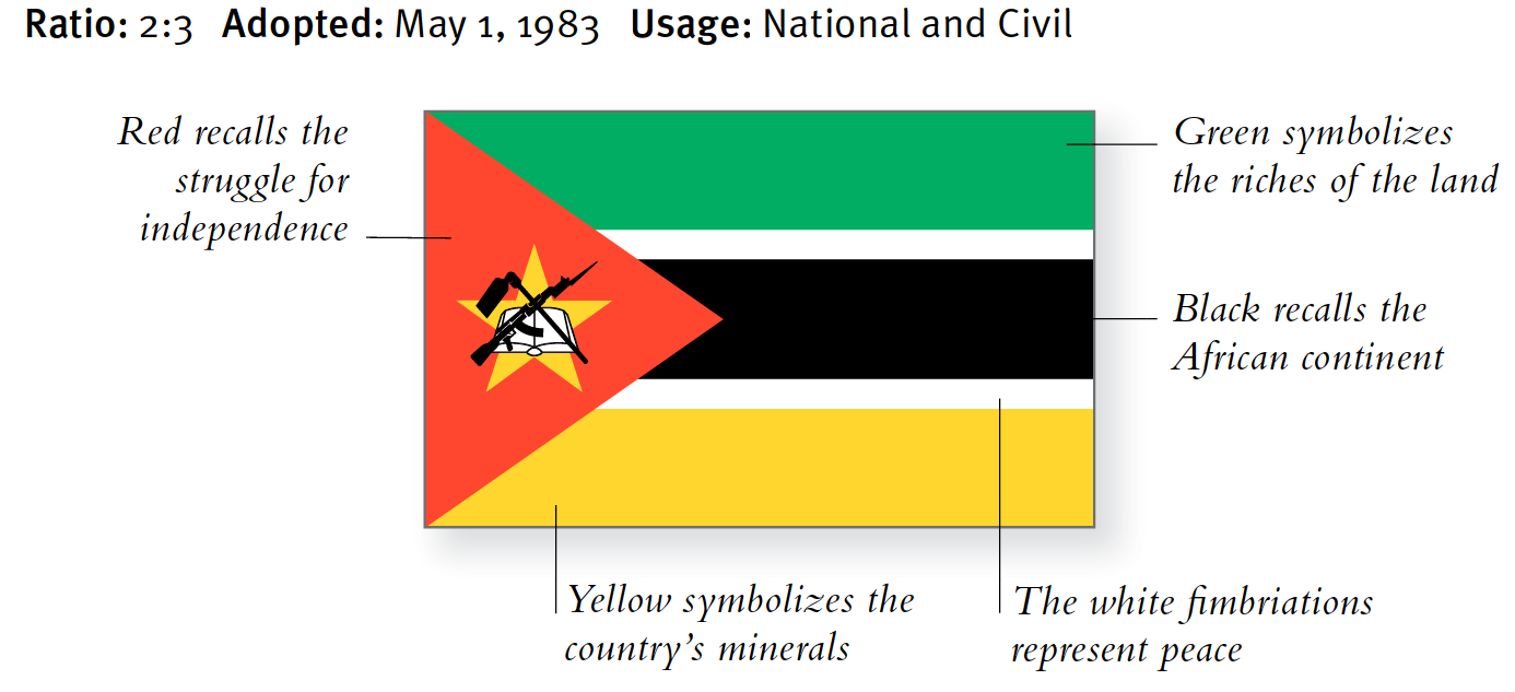 Die ursprüngliche Flagge der Frente da Libertação da Moçambiquee (frelimo), der führenden politischen Partei in Mosambik, hatte ebenfalls grüne, schwarze und gelbe horizontale Streifen, die durch weiße Zacken getrennt waren. Im Hebezeug befand sich ein rotes Dreieck. Die Farben Schwarz, Grün und Gelb wurden von der Flagge des African National Congress abgeleitet, die im Süden verwendet wird Afrika. Mit der Unabhängigkeit wurden die Farben neu angeordnet, um die Nationalflagge zu bilden, deren Strahlen vom oberen Hebezeug ausgehen. Darüber befand sich ein weißes Zahnrad, das die Hacke, das Gewehr, das Buch und den Stern enthielt, die auf dieser Flagge abgebildet sind. Die Flagge wurde 1983 geändert; Die Farben wurden in horizontalen Streifen angeordnet und der Stern des Marxismus vergrößert.