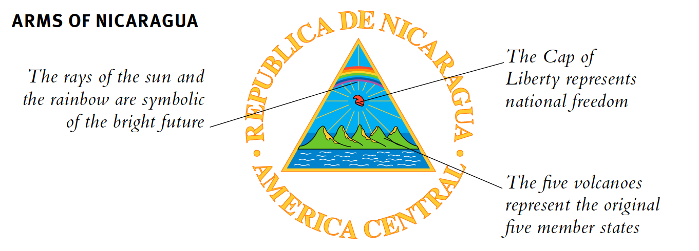 Die heute verwendete Flagge und das Wappen Nicaraguas sind denen der Vereinigten Provinzen Mittelamerikas am ähnlichsten. Das Dreieck, die Vulkane, die aufgehende Sonne, das Cap of Liberty und der Regenbogen waren alle auf dem ursprünglichen Emblem zu sehen. Das heute verwendete Wappen enthält den Namen des Staates, Republica de Nicaragua 1823 lautete der Titel Provincias Unidas del Centro de America. Im Jahr 1908 wurde die Entscheidung getroffen, zu den von den Vereinigten Provinzen Mittelamerikas verwendeten Emblemen zurückzukehren und spiegelte Nicaraguas Bestrebungen nach einer Wiedergeburt der von den fünf Nationen gebildeten politischen Einheit wider.