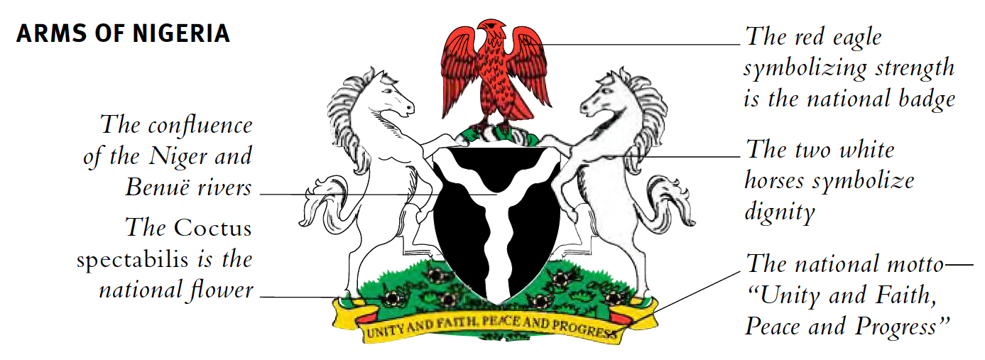 Die Nationalflagge ist eine Adaption des Siegerbeitrags eines Wettbewerbs aus dem Jahr 1959. Das Original hatte eine rote Sonne mit strömenden Strahlen oben auf dem weißen Streifen. Dies wurde von den Richtern entfernt und die Flagge wurde seitdem nicht verändert. Wie Ghana verfügt auch Nigeria über spezielle Flaggen für Zivil- und Marineschiffe einst hatten auch die Bundesstaaten Flaggen. Das Wappen wurde 1960 verliehen, das Motto wurde jedoch seitdem geändert und enthält jetzt die Worte „Frieden und Fortschritt". Der Schild stellt den Zusammenfluss zweier Flüsse dar und das Wappen ist ein roter Adler. Alles steht auf einem grünen Sockel, der mit der Blüte des Coctus spectabilis übersät ist.