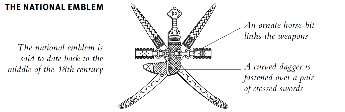Bis 1970 trug Oman das schlichte rote Banner der Ureinwohner, der Kharijite-Muslime. 1970 führte der Sultan einen völlig neuen Satz Nationalflaggen ein. Der Hosenschlitz wurde mit grünen und weißen Streifen versehen und das nationale Emblem, das Abzeichen der Abusaidi-Dynastie, wurde im Kanton angebracht. Dargestellt sind gekreuzte Schwerter, darüber ein Gambia, ein traditioneller Krummdolch.