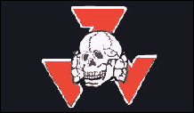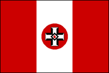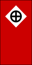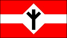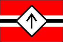 Diese neue Flagge ist eindeutig vom traditionellen Design der Nationalsozialisten inspiriert, weist jedoch anstelle einer weißen Scheibe mit schwarzem Hakenkreuz eine weiße Raute auf, die ein schwarzes Sonnenrad umschließt. Zu den Flaggenvarianten gehören Rauten mit schwarzem Rand oder ohne Rand. |