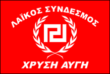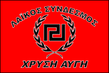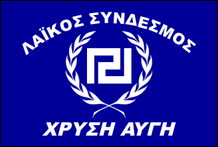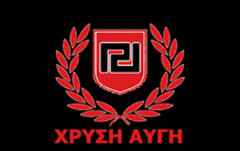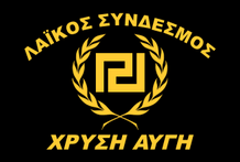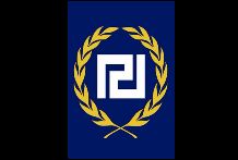 Ende 2013 wurde eine neue Flagge mit Mäander in einem Kranz eingeführt, umgeben von Der vollständige Name der Partei ist aufgetaucht. Sein Feld ist rot und die Ladungen sind schwarz, die Fimbrien sind weiß. Die frühesten Fotos finden sich zunehmend auch im Ausland, von Ultrarechten, die gleichgesinnten „Verfolgten" ihre Unterstützung zeigen wollen, angesichts der seit 2012 mehrfach erhobenen Strafanzeigen gegen die Partei und ihre Mitglieder. lediglich als „Verfolgungs"-Kampagne. |
