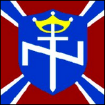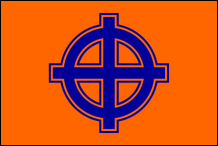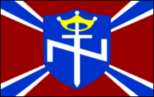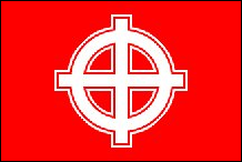 Die britische Bewegung (Vereinigtes Königreich) Britische nationalsozialistische Bewegung Die British Movement (BM) wurde 1968 von ehemaligen Mitgliedern der British National Socialist Movement (BNSM) gegründet, einer ähnlichen Organisation, die 1962 gegründet wurde. Während die gesamten 1970er Jahre aktiv waren, brach die Gruppe Anfang der 1980er Jahre als geschlossene Gruppe zusammen Reste haben bis heute überlebt. Die Flagge ist blau und mit einem roten Sonnenkreuz oder „Sonnenrad" auf einer weißen Scheibe versehen. Es wurden blaue Armbinden mit dem gleichen Design verwendet. Diese Flagge wurde in jüngerer Zeit gelegentlich von der British National Party (BNP) verwendet. Die BM verwendete auch eine zeremonielle Flagge oder ein Banner, das sie „Ehrenstandarte" nannten. Es war mit einer weißen Aufschrift „BRITAIN" (oben) und einer weiteren weißen Aufschrift „AWAKE" (unterhalb) des Sonnenrads versehen und hatte einen weißen Rand. Geflogen wurde es meist von einem Stab mit der Querlatte. Über dem Banner waren normalerweise ein Abschluss im Sonnenradstil und ein Namensschild mit den Initialen BM angebracht. Manchmal wurde unten am Stab ein weiteres ähnliches Namensschild angebracht. Es war natürlich so gestaltet, dass es dem zeremoniellen Banner der Deutschen Nationalsozialistischen Bewegung (NSDAP) ähnelte und dazu beitrug, die britische Bewegung mit ihrem deutschen Vorgänger zu identifizieren. Dieses zeremonielle Design wurde auch auf Handfahnen verwendet. |