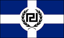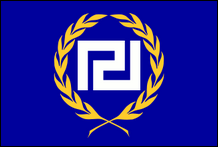Banner der Goldenen Morgenröte Wird auch von Einheit 88 (Neuseeland) verwendet Die Prasini Pteryga (Grüner Flügel) ist eine Ökologenorganisation, die von Mitgliedern des Jugendflügels der Goldenen Morgenröte gegründet wurde. Es wird eine grüne Flagge verwendet, die mit einem weißen keltischen Kreuz mit äußeren weißen und inneren grünen Fimbriationen versehen ist. Eine neue Flagge, die 2010 erscheint, hat ein blaues Feld und ist mit einem kleineren Maeandros (Mäander) innerhalb eines Kranzes zwischen den Inschriften LAIKOS SYNDESMOS (Volk) beladen Association) und H RYSI AYGI (Golden Dawn), möglicherweise jetzt der offizielle Name der Organisation. Eine weitere Golden Dawn-Flagge (Variante Nr. 5), die eine Kombination aus den Farben eines Fußballvereins (Orange und Blau) verwendet, wird jetzt von einigen Fans des Apoel Football Club aus Nikosia, Zypern, verwendet. Dies ist ein Beispiel dafür, wie Ultrarechte versuchen, die normale Gesellschaft zu infiltrieren, und indem sie Fußballfans ihre Flagge als unpolitisches Symbol vorstellen, erhalten sie ein wertvolles Instrument für die spätere Indoktrination.